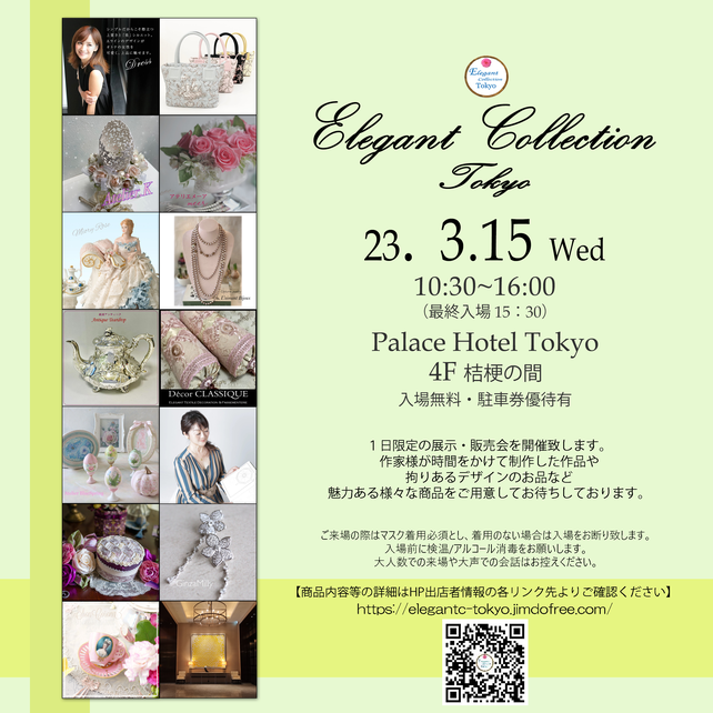 2023年3月15日(水)エレガントコレクション東京に出店いたしました イベント イベント出店 エレガントコレクション東京 パレスホテル東京 気になるイベントがありましたら、シェアお願いします! URLをコピーしました! 「丸の内丸善本店 フランス物語」 に出展いたしました 関連記事 「西宮阪急百貨店 フランス展」に出店いたします 2025年12月29日 「日本橋三越本店 三越手芸」に出店いたします 2025年12月29日 「エレガントコレクション東京」に出店いたします 2025年12月29日 「日本橋三越フランス展 2025」に出展いたしました 2025年8月22日 「日本橋三越フランス展 2024」に出展いたしました 2024年7月22日 フランス展2024 in 京都伊勢丹に初出展いたしました 2024年6月20日 「丸の内丸善本店 フランス物語」 に出展いたしました 2023年6月13日